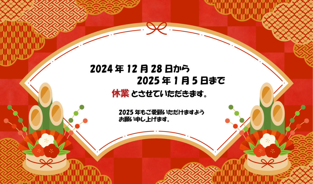 年末年始のご案内 投稿公開日:2024年12月16日 投稿カテゴリー:未分類 おすすめ 年末年始のご案内 2025年12月22日 謹んで年始のご挨拶を申し上げます。 2024年1月5日 ホームページリニューアル致しました 2022年6月1日